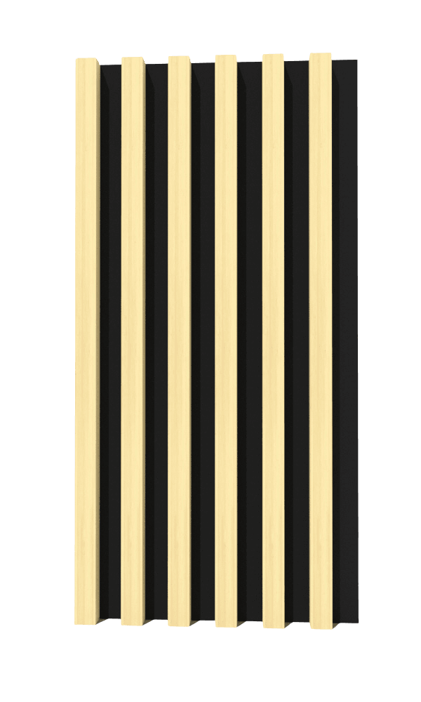 The panel is made from solid pine slats, which are made in size 45x45mm and lengthened to 1200mm as a result of technical operations. The acoustic base of the panel consists of the acoustic fabric Nordisk acoustic 270A, which provides the acoustic function to the panel. The pine slats are stapled to the veneer cross slats with clamps, through the 15mm thick plywood cross slat, which ensures that the slats do not move. The slats are treated with an tone stain and varnish – Tikkurila fonte fire, which provides toning of the slats. It should be noted that a tree exposed to long-term UV rays may change its original appearance over time. Wood is a natural product and each panel is unique, therefore it should be noted that color, tone and structural differences are considered normal and part of the design.